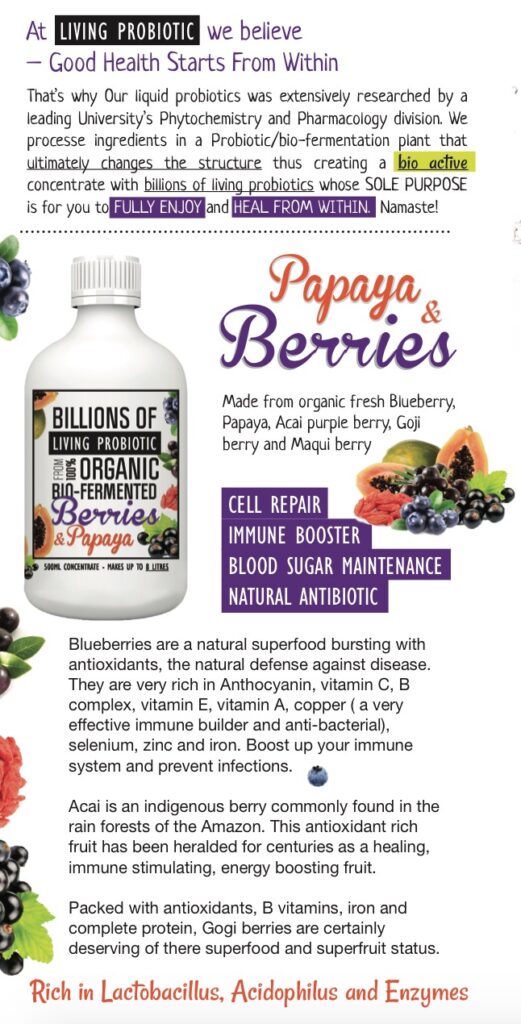 Billions of Living Probiotic from 100% Organic Bio-Fermented fresh Blueberry, papapaya fruit, Acai purple berry, Goji berry, Maqui berry of equal amounts. For Cell Repair, Immune Booster, Blood Sugar Maintenance and Natural Anti-biotic.